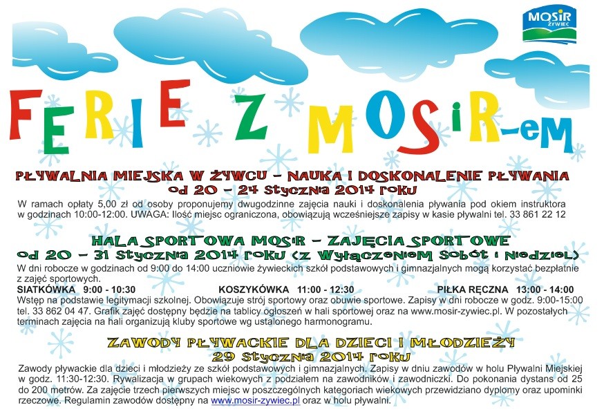 Dzieci oraz młodzież szkolną zapraszamy do zapoznania się z ofertą MOSiR-u na ferie 2014!