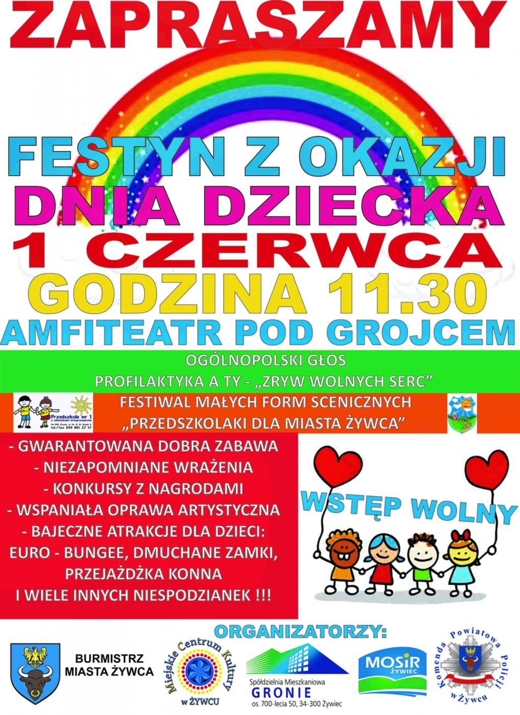 Festyn z okazji dnia dziecka odbędzie się w środę 1 czerwca br. w Amfiteatrze pod Grojcem. Serdecznie zapraszamy wszystkie dzieci na godzinę 11.30!