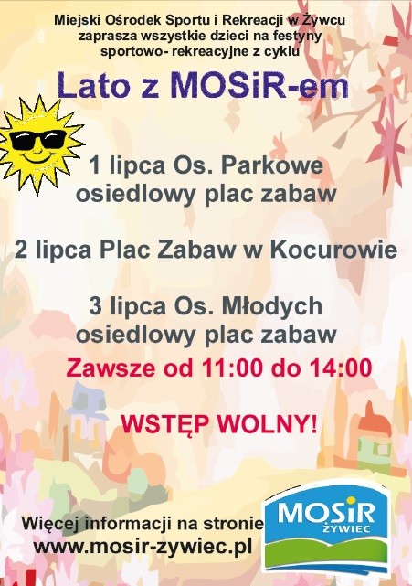 Miejski Ośrodek Sportu i Rekreacji w Żywcu zaprasza wszystkie dzieci na festyny sportowo-rekreacyjne dla dzieci z cyklu " WAKACJE NA SPORTOWO I WESOŁO", które odbędą się terminach: