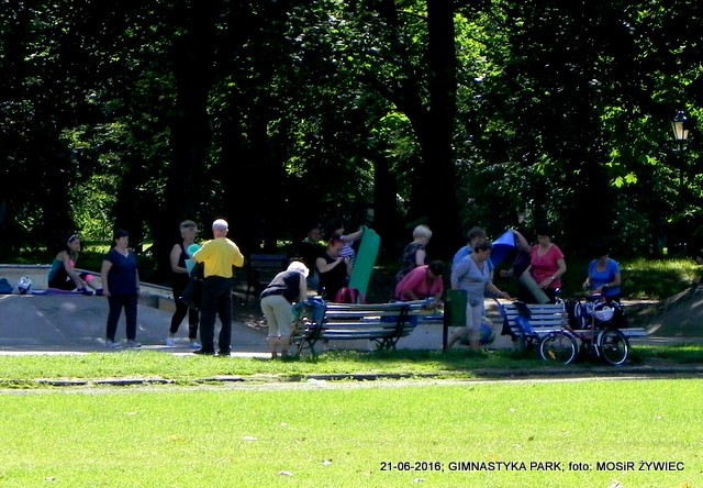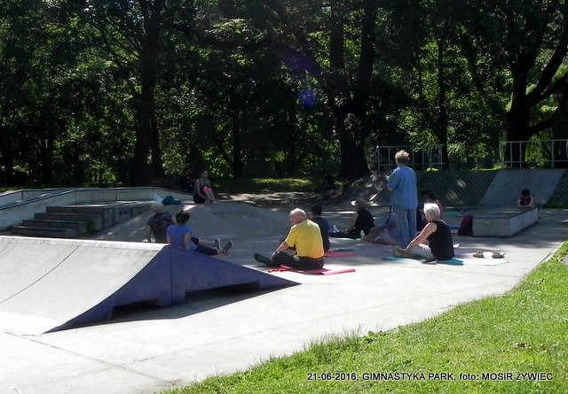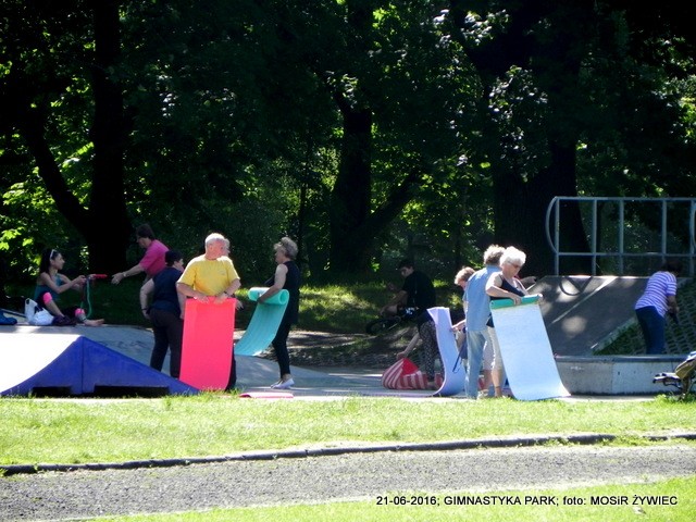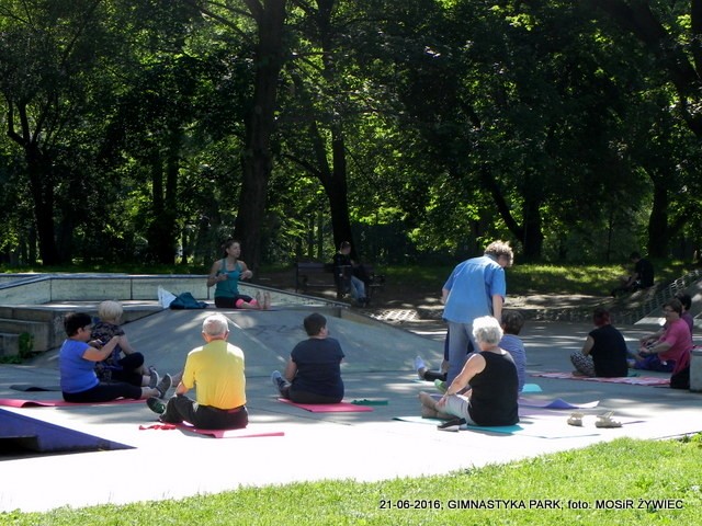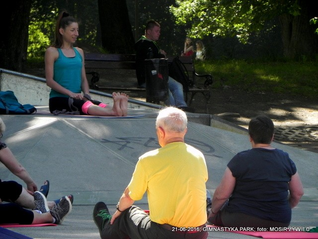 Piękna pogoda i grupa seniorów w parku poprawiająca swoją kondycję poprzez ćwiczenia wzmacniające zarówno mięśnie i kości. Zestaw ćwiczeń przygotowanych przez trenerkę Ewelinę Cienkus, poza poprawą kondycji gwarantuje także lepsze samopoczucie, co jest związane z wydzielaniem podczas treningu związków zwanych endorfinami (hormonami szczęścia).