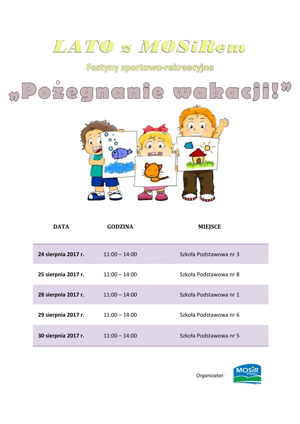 Cykl festynów kończących wakacje przeznaczony dla najmłodszych na osłodę tych ostatnich wolnych dni. W tym roku spotykamy się: