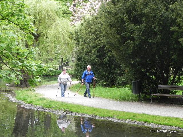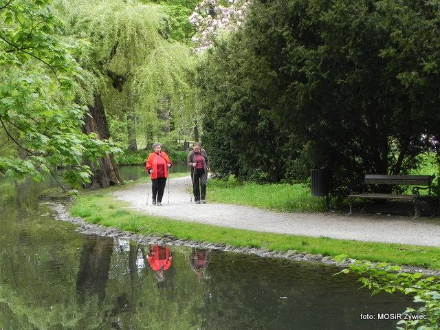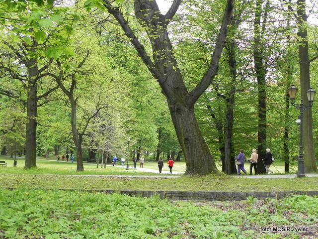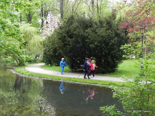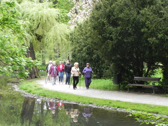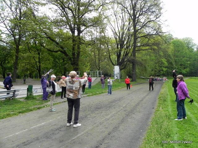Zajęcia seniorów w Parku Żywieckim w poniedziałkowe przedpołudnie.