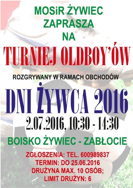 MOSiR Żywiec zaprasza do udziału w turnieju oldboy'ów organizowanym w ramach DNI ZYWCA 2016. Rozgrywki odbędą się na boisku "Orlik" w Żywcu-Zabłociu. Limit drużyn: 6, decyduje kolejność zgłoszeń. Drużyna liczyć ma max. 10 osób.