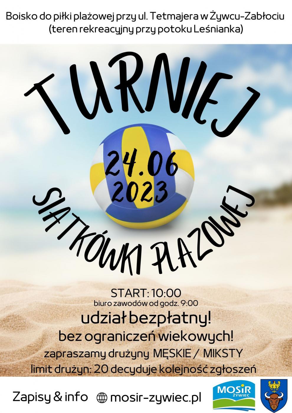 W sobotę 24 czerwca na boisku do piłki plażowej przy ul. Tetmajera w Żywcu-Zabłociu (na terenach rekreacyjnych przy potoku Leśnianka) odbędzie się Turniej Siatkówki Plażowej. Serdecznie zapraszamy wszystkich chętnych - udział jest bezpłatny!