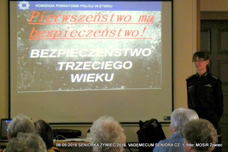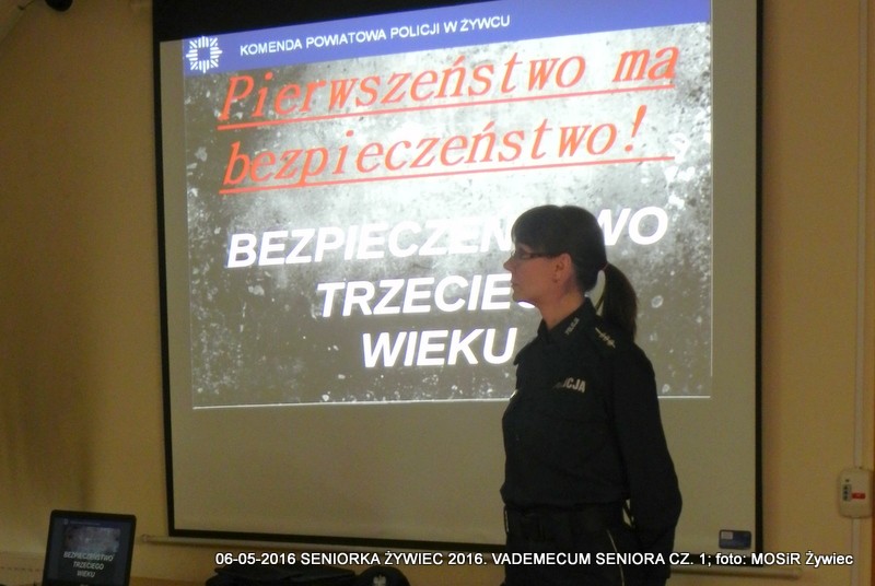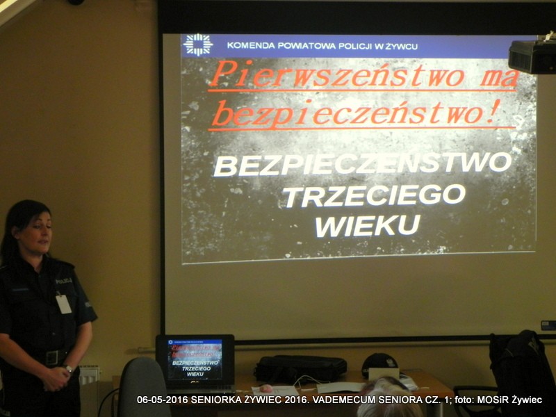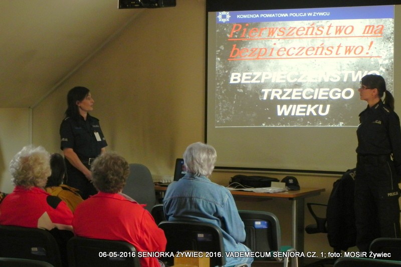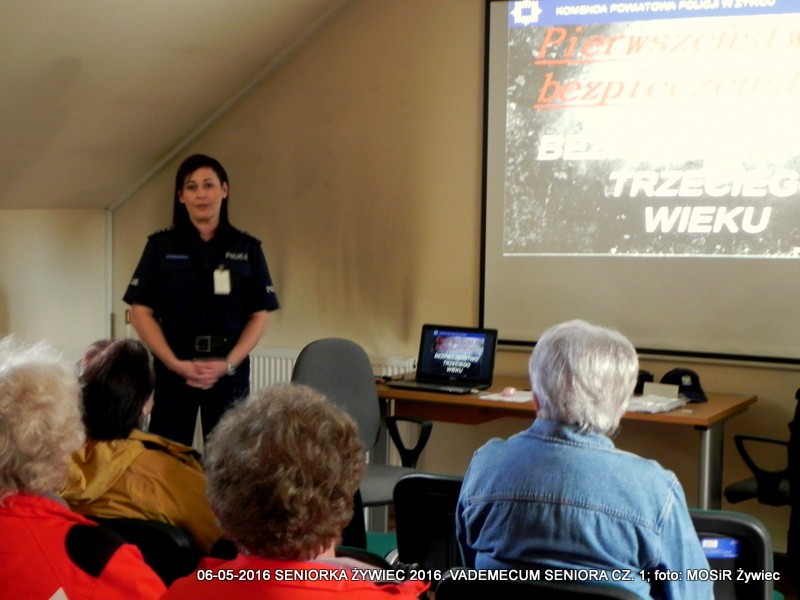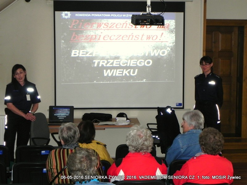 Miejski Ośrodek Sportu i Rekreacji w Żywcu oraz Komenda Powiatowa Policji w Żywcu realizują w ramach projektu SENIOR/KA ŻYWIEC 2016 cykl warsztatów informacyjnych pt. VADEMECUM SENIORA. Hasło przewodnie spotkań prowadzonych przez Monikę Chojnacką z wydziału prewencji i Mirosławę Piątek (rzeczniczkę KPP) brzmi: Razem bezpieczniej!