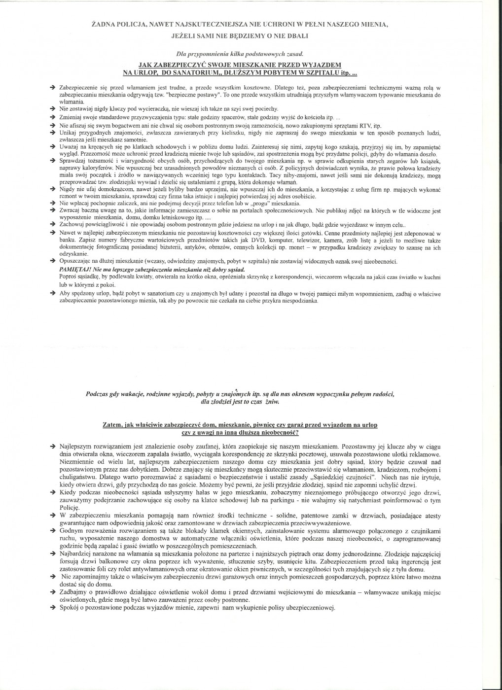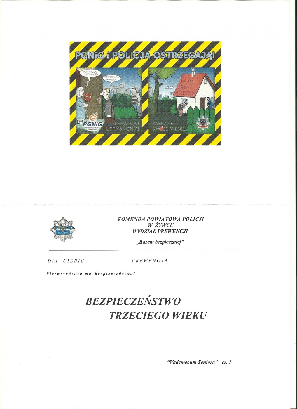 Część 1 '"VADEMECUM SENIORA" nosi tytuł BEZPIECZEŃSTWO TRZECIEGO WIEKU i poświęcona jest tematowi: Jak zabezpieczyć swoje mieszkanie przed wyjazdem na urlop, do sanatorium, dłuższym pobytem w szpitalu, itp. (materiał do pobranie na dole strony).